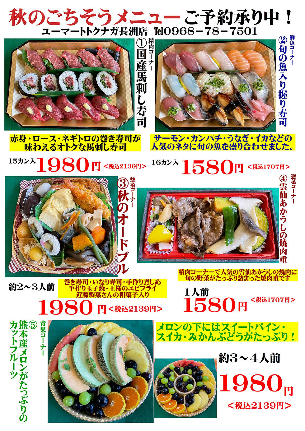 秋のごちそうメニューご予約承り中!2021年9月2日読了時間: 1分食欲の秋到来です。当店では各コーナーよりおいしいごちそうメニューのご予約を承っております。当店スタッフまでお気軽にお申し付けください。